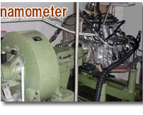 試験室内で自動車を走らせながら様々な試験や測定をするためにローラーで駆動輪の回転を受ける構造を持ちます。 吸気系、排気系のエンジン特性に関わる要素やミッション、デフなど駆動系の特性を全て含んだ自動車の性能を評価する設備といえます。 | エンジン単体の性能評価や各種試験を行うための装置です。 レースの世界ではエンジンチューナーが様々なカテゴリーのエンジンをチューニングするために使用しています。 自動車メーカーでは新型エンジンの開発や部品の開発に用いています。 | ![]() |